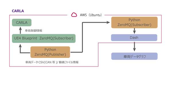 車両等の実測データを確認・検証する際に、グラフのみだと振る舞いのイメージが付きにくいという課題がある為、車両本体の時系列性を持った3次元的振る舞いと、各計測データのグラフ、カメラ動画を同時に可視化する環境を構築。